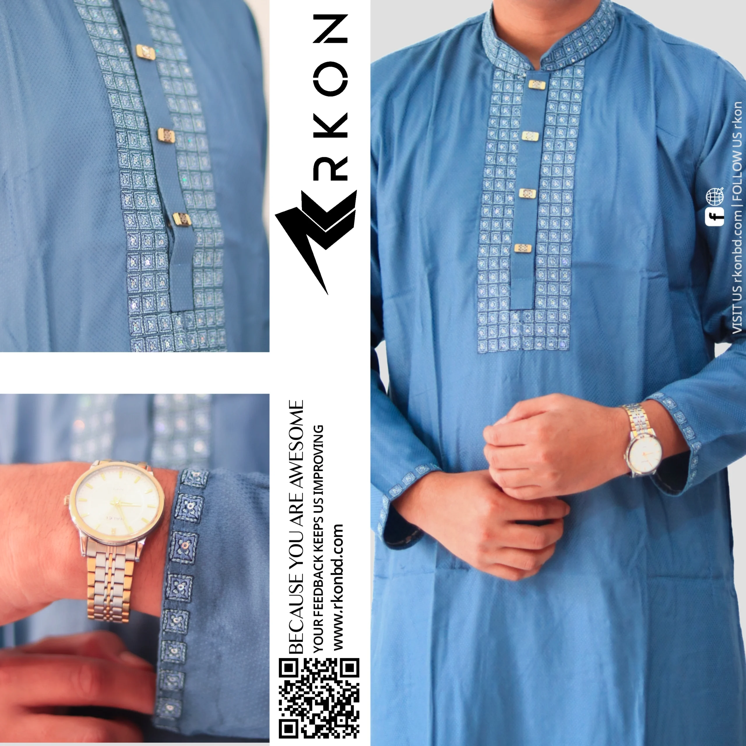 Elegantly tailored in a regular fit, this Black Range Panjabi is crafted from premium blended jacquard fabric. Featuring tonal Zardozi work on the placket and collar band with matched sequins and materials, it exudes understated luxury. Finished with a double placket, dyed-to-match buttonholes, refined buttons, and decorative stitching on the sleeve hem—perfect for timeless festive sophistication.